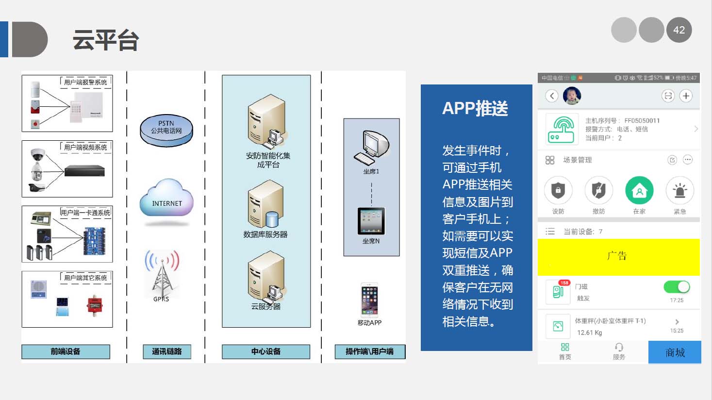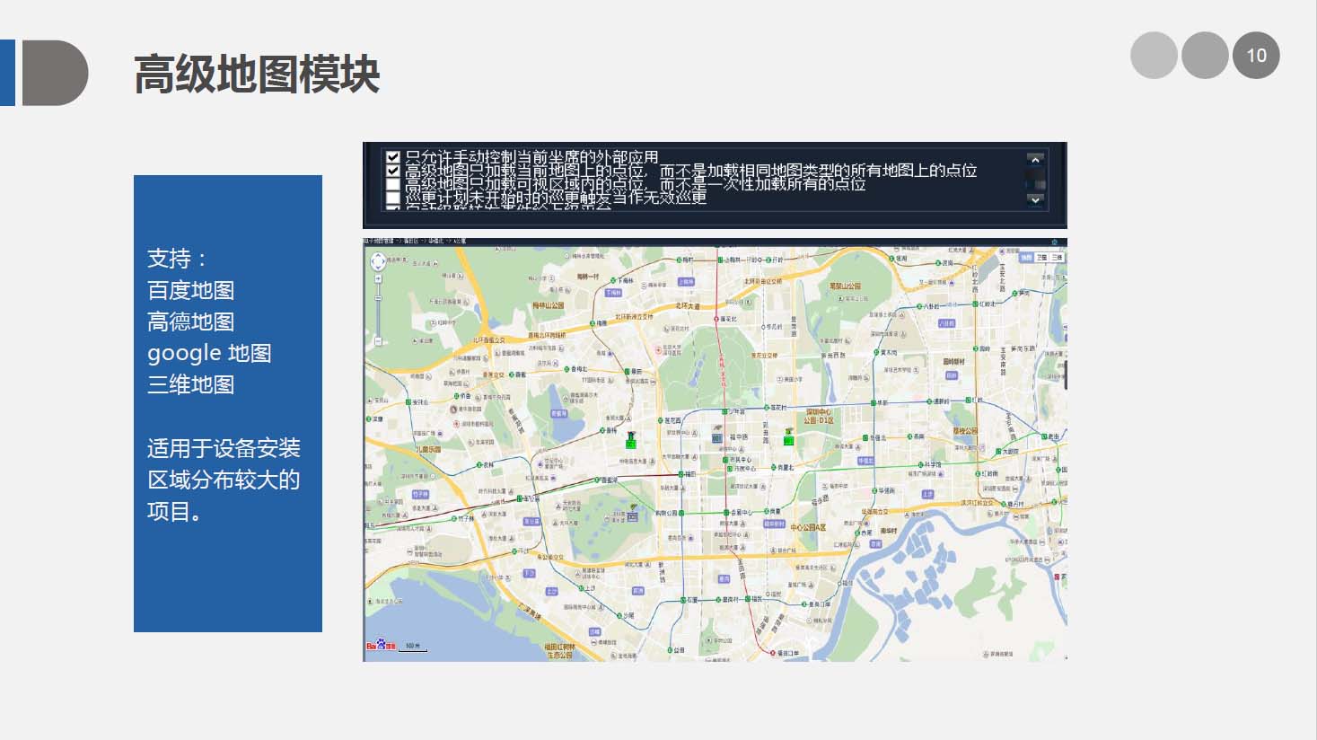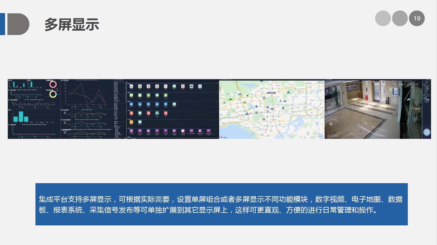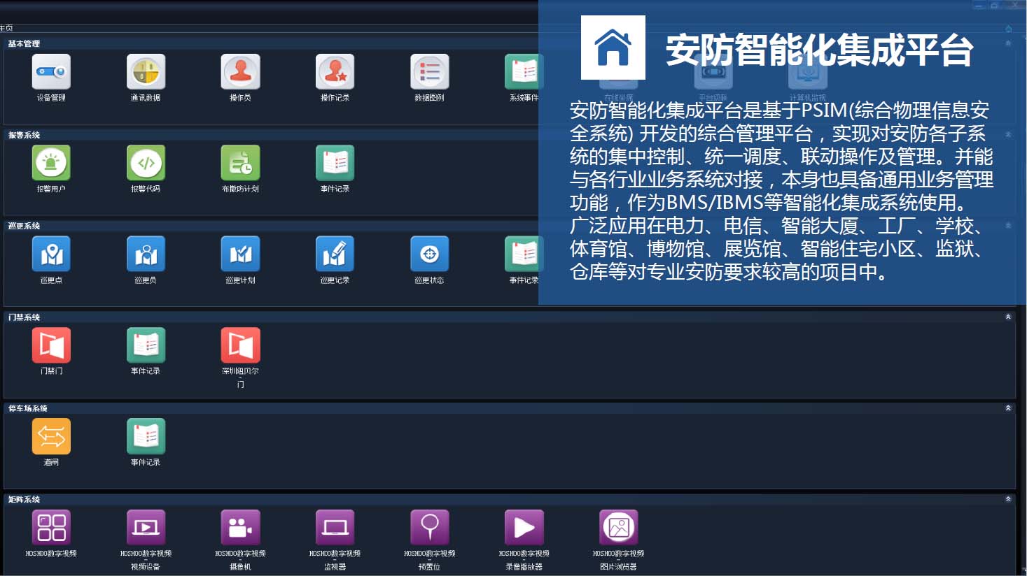 安防智能化集成平臺是我司自主研發(fā)的,基于PSIM(綜合物理信息安全系統(tǒng)) 開發(fā)的綜合管理平臺,實現對安防各子系統(tǒng)的集中控制、統(tǒng)一調度、聯(lián)動操作及管理。并能與各行業(yè)業(yè)務系統(tǒng)對接,本身也具備通用業(yè)務管理功能。