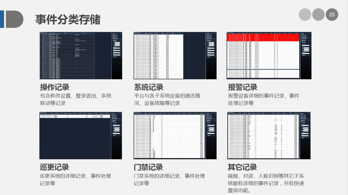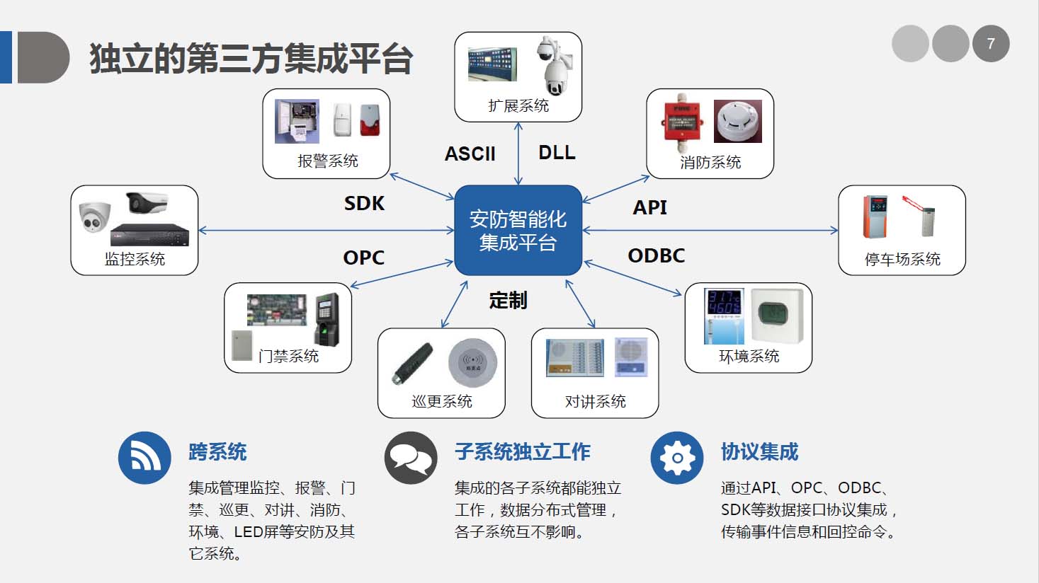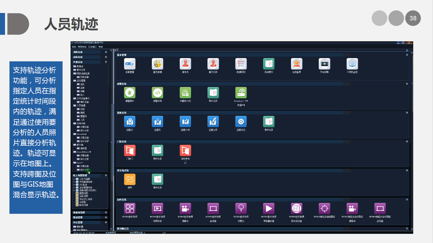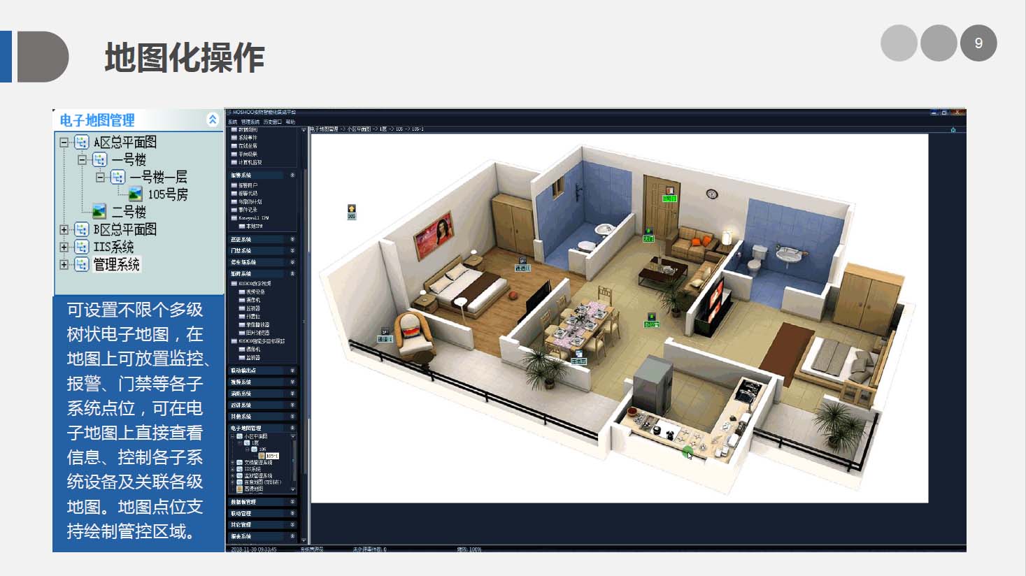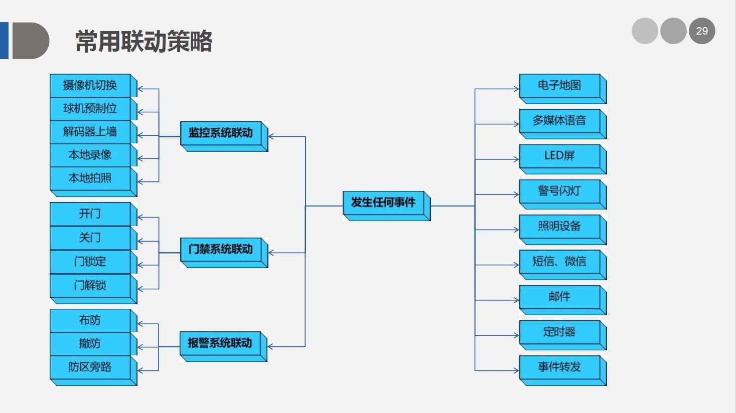 安防智能化集成平臺能實現對視頻、門禁、報警、對講、巡更、車輛管理等多個子系統(tǒng)集中控制,統(tǒng)一調度使用,實現各個子系統(tǒng)之間的聯(lián)動操作及管理。高度智能化的綜合安防管理平臺應具有適應于各種不同需求的網絡架構、高度的可靠性、良好的人機交互界面、易于管理及維護、學習簡單及操作方便等特點。