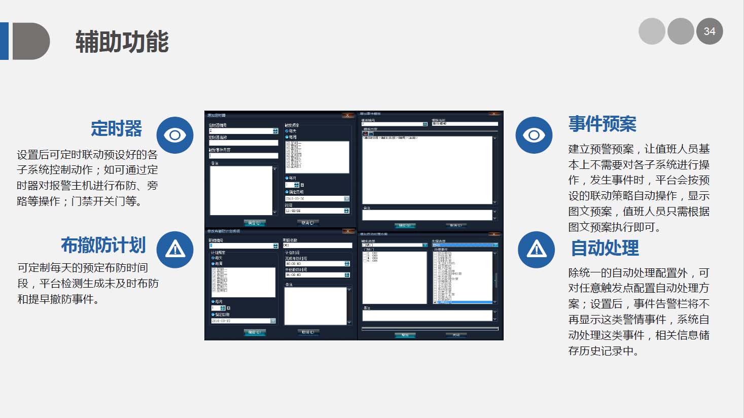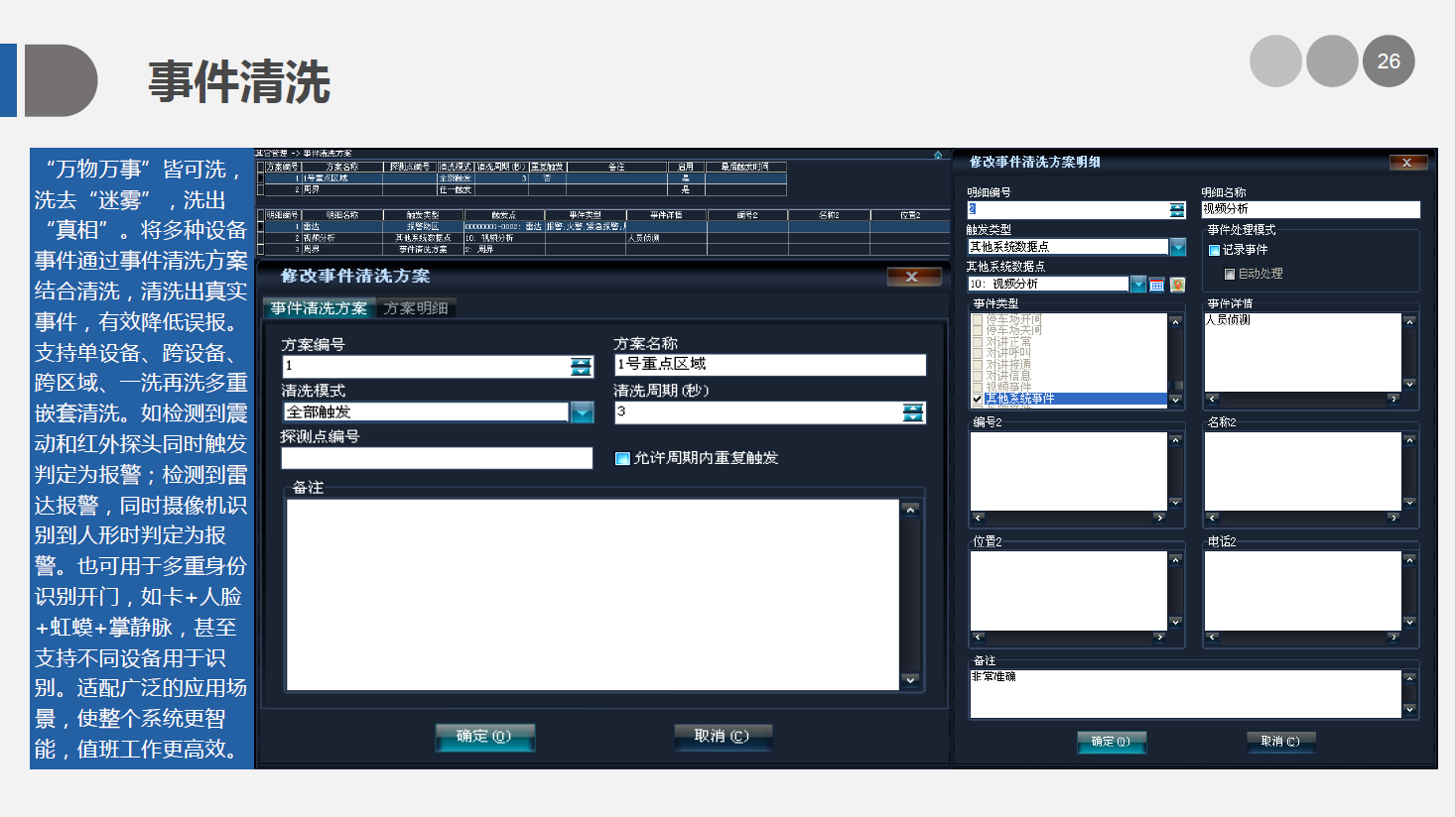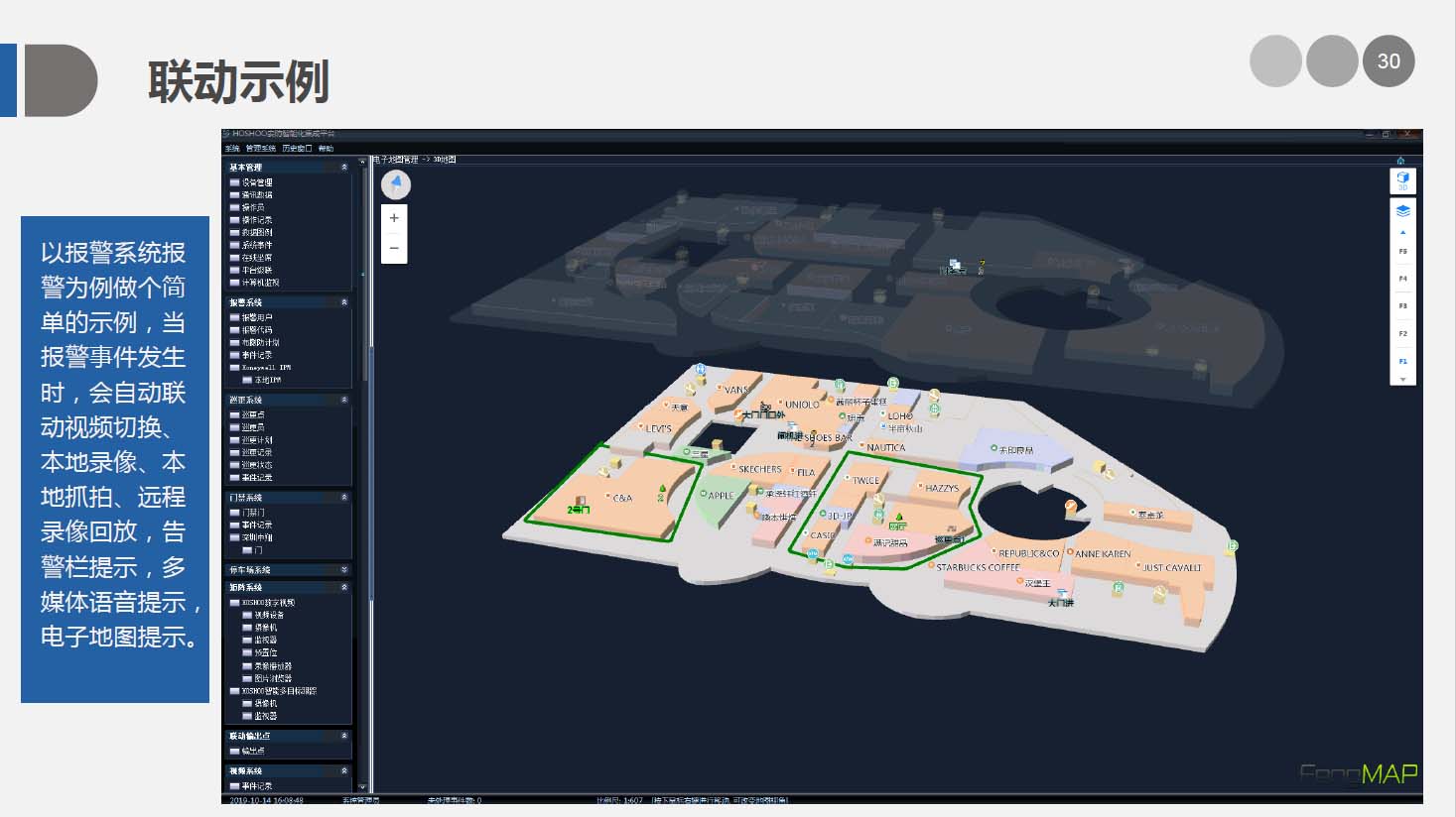 安防智能化集成平臺可根據實際需求任意擴充功能模塊進行,并可以通過平臺實現各個系統(tǒng)之間的聯(lián)動、協(xié)調工作。從而大大減少了硬件設備和工程的數量,提高整個系統(tǒng)的自動化程度和監(jiān)控中心的工作效率,完美地將這些系統(tǒng)之間的功能通過安保集成系統(tǒng),來體現發(fā)生事件時如何做自動化處理及相應流程。