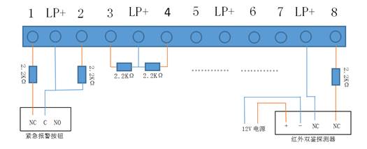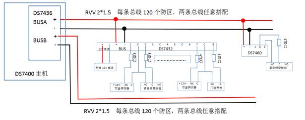 擴(kuò)展防區(qū)則需要增加雙回路總線驅(qū)動(dòng)器(DS7436),擴(kuò)展防區(qū)都接在兩條總線上