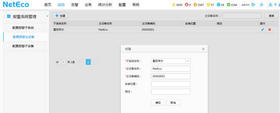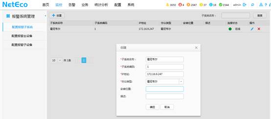 登錄NetEco,進(jìn)入【監(jiān)控?報(bào)警系統(tǒng)?配置報(bào)警子系統(tǒng)】頁(yè)面,點(diǎn)擊【創(chuàng)建】按鈕,填寫(xiě)相關(guān)信息。子系統(tǒng)名稱可以自行命名,子系統(tǒng)編碼對(duì)應(yīng)第1步中報(bào)警系統(tǒng)的設(shè)備編碼,IP地址為報(bào)警系統(tǒng)軟件所在服務(wù)器的IP地址,協(xié)議類型選擇霍尼韋爾。