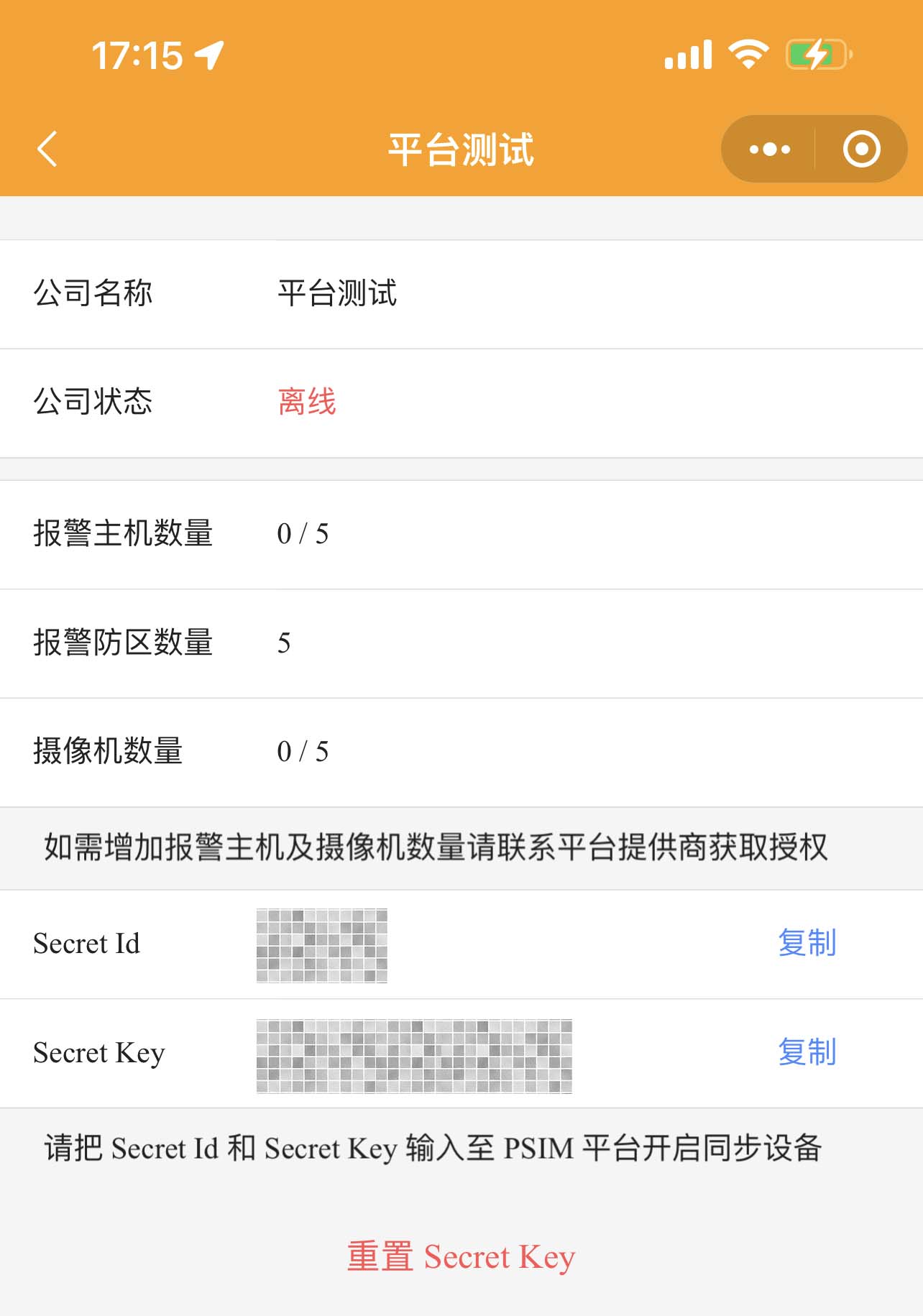 3、初次使用無任何設備,需在【我的】→【關聯(lián)PSIM平臺】申請綁定,綁定后將隨機獲得登錄賬號(Secret ID)和登錄密碼(Secret Key)。在PC端集成平臺軟件中設置2個設備完成和PSIM平臺助手通訊。