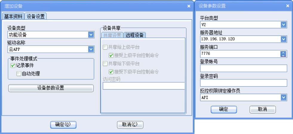 設備類型:功能設備,設備名稱:云APP,點擊【設備參數(shù)設置】
