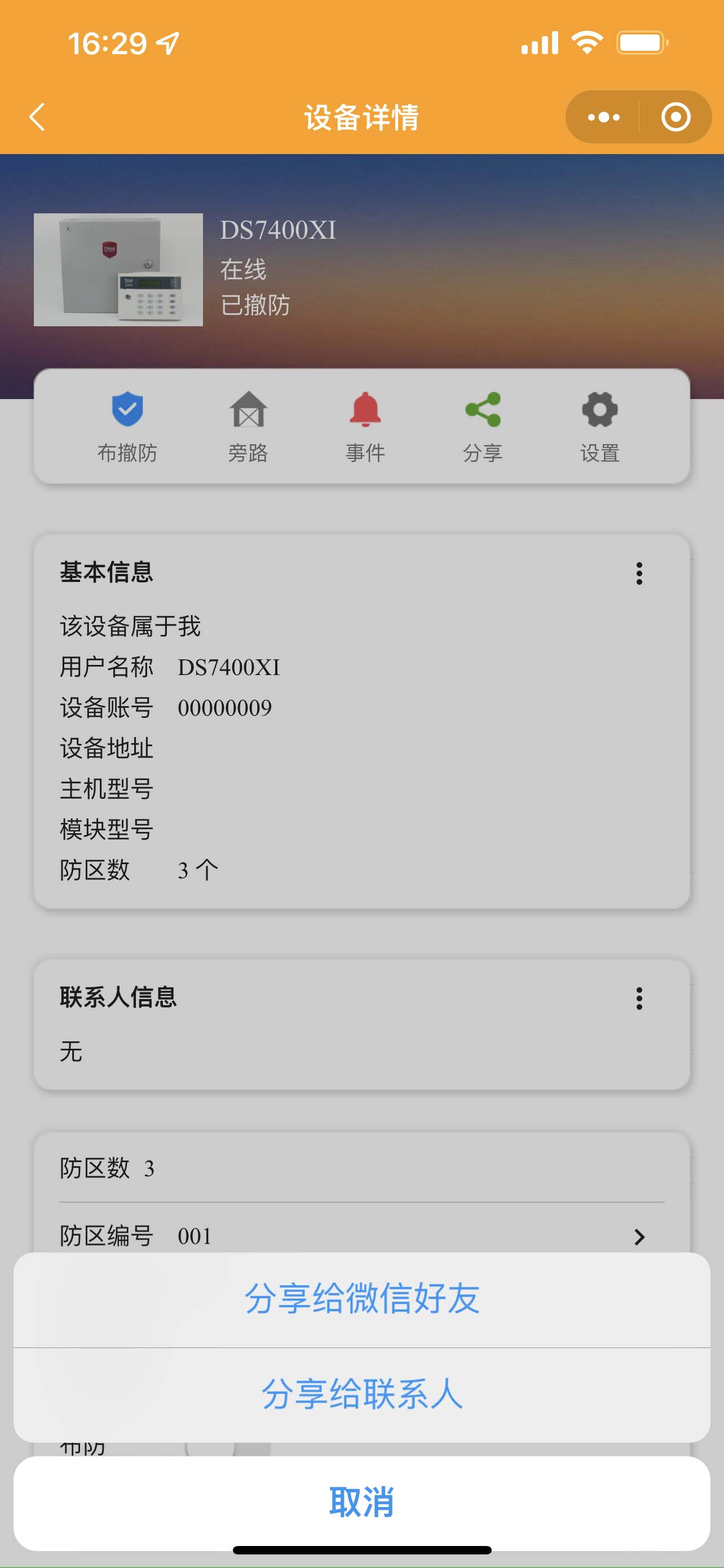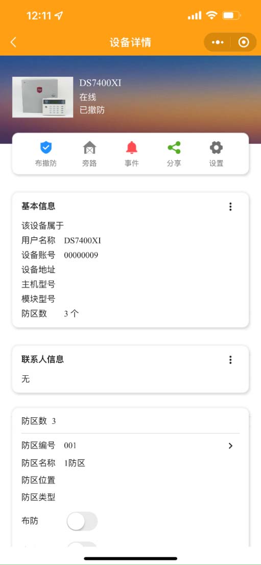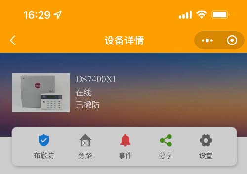 中部是快捷按鈕可以布撤防主機,旁路防區(qū)、查看事件、分享設備、設置等;