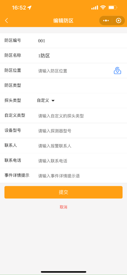 2.3 設置防區(qū)信息:可編輯防區(qū)位置、探頭類型、自定義類型、設備型號、聯(lián)系人、聯(lián)系電話、事件詳情提示。點擊防區(qū)位置右側圖標可設置防區(qū)定位。防區(qū)編號、防區(qū)名稱、防區(qū)類型需通過PC端集成平臺修改后同步。