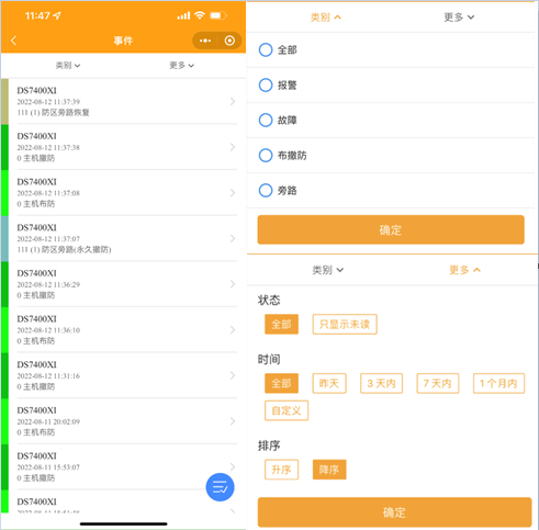 2.7 查詢事件:點擊事件按鈕進入事件界面,點擊類別和更多可按警情和時間分類查詢事件。點擊藍色按鈕把事件全部標記為已讀。