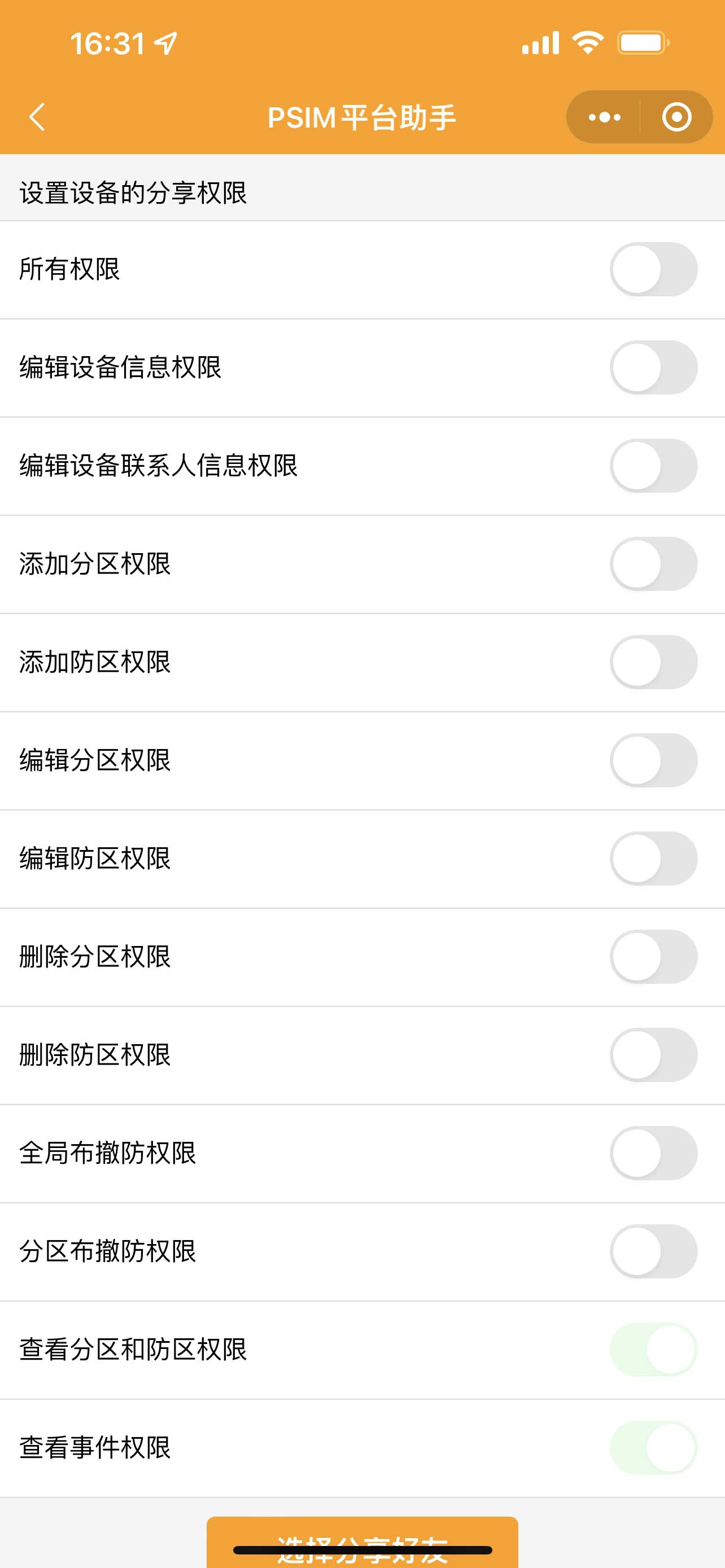 3. 選擇好友的權限,默認只有查看分和防區(qū),查看事件權限。需要其他權限右劃打開。