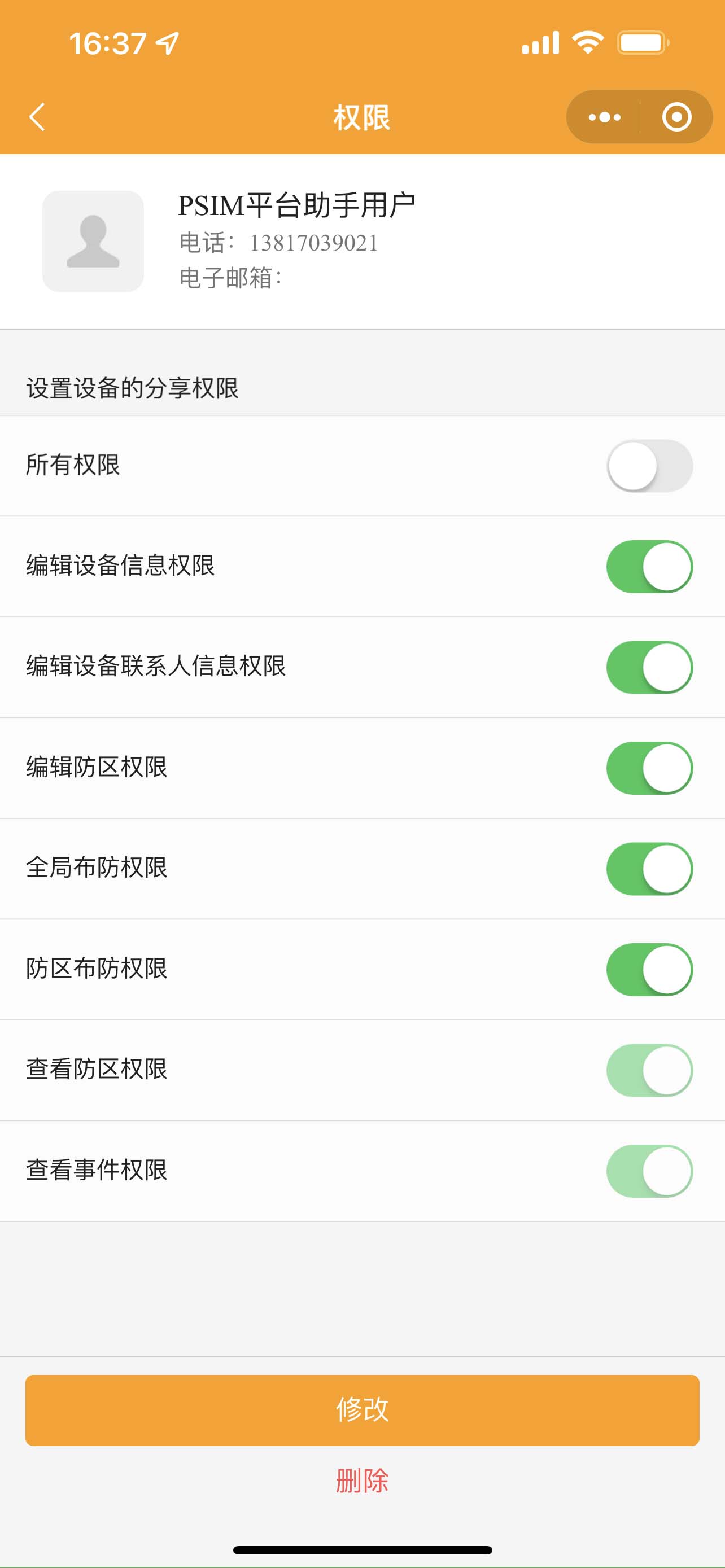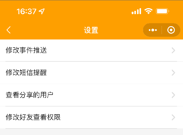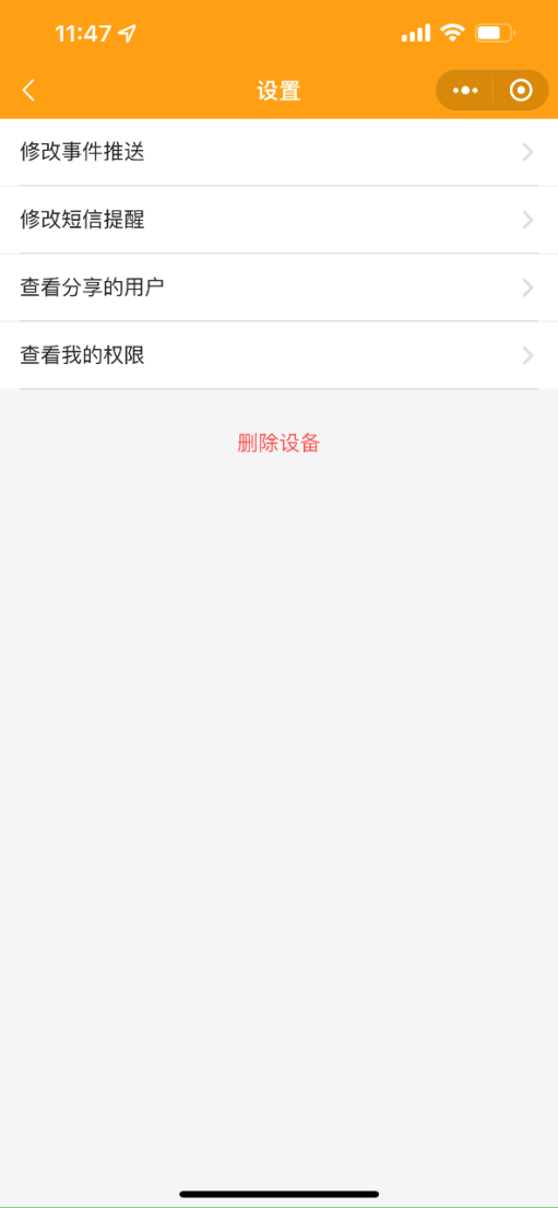 1. 設置:可修改事件推送、修改短信提醒、查看分享用戶、查看我的權限、刪除設備操作。