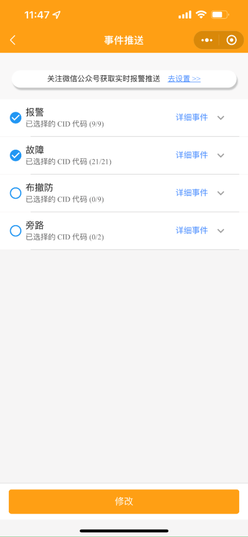 1.1 修改事件推送:勾選需要推送的事件類型,點擊修改確認。點擊【去設置】關注微信公眾號“5G智聯(lián)運維助手”,獲取設備報警推送信息。