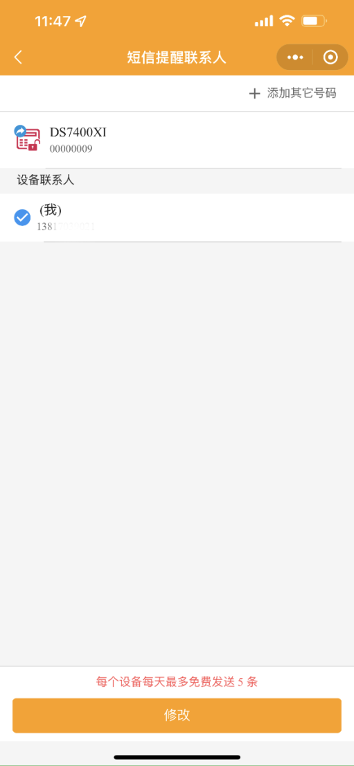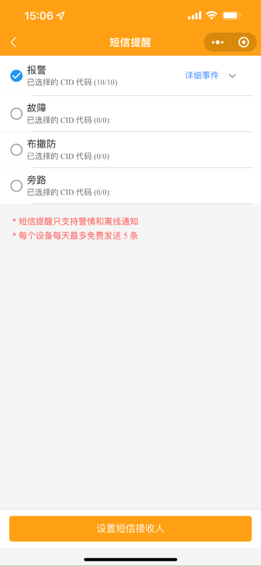 1.2 修改短信提醒:短信提醒只支持警情和離線通知,每個設備每天最多免費發(fā)送5條,可添加多個號碼設置推送。