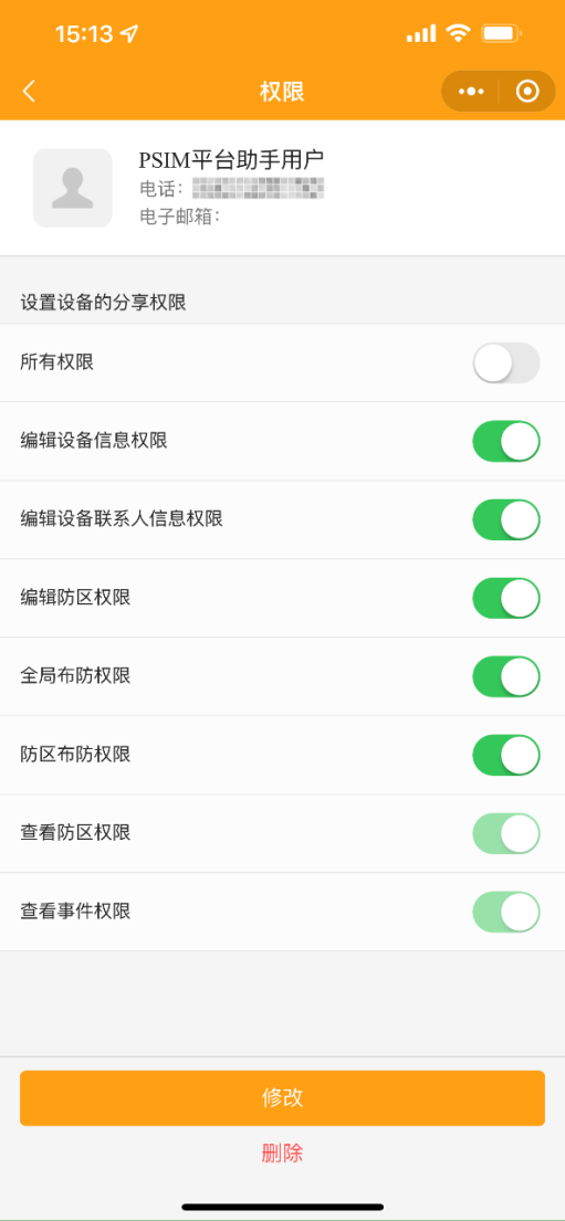 1.3 查看分享的用戶:點擊進入權限界面,查看分享的用戶列表。點擊一個用戶進入權限界面,修改或刪除該用戶權限。