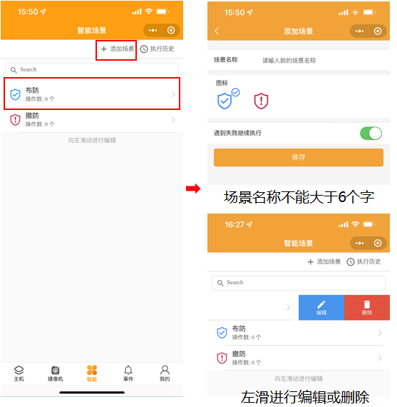 1.5 智能場景:智能界面設置快捷方式,點擊【添加場景】輸入場景名稱選擇圖標添加操作按鈕。點擊布防場景圖標,進行添加操作。