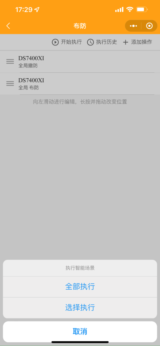 進入布防場景后點擊添加操作,選擇設備。單個場景可添加多個操作(多個命令和設備),重復添加操作步驟即可。