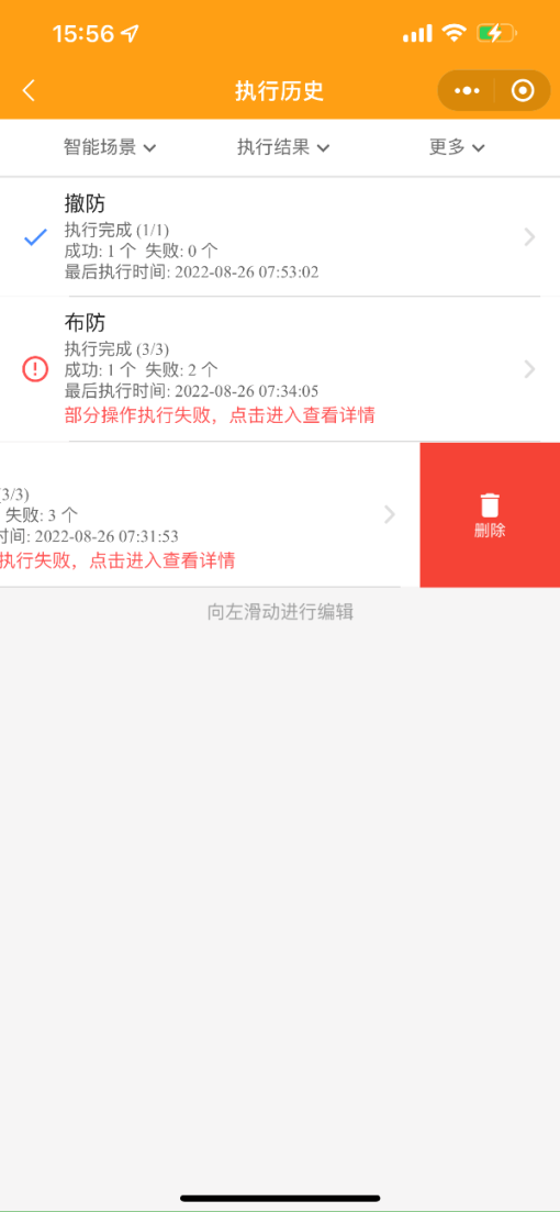 點擊執(zhí)行歷史按鈕,可通過智能場景、執(zhí)行結果、更多選項查詢。點擊進入查看詳情,左滑可刪除記錄。
