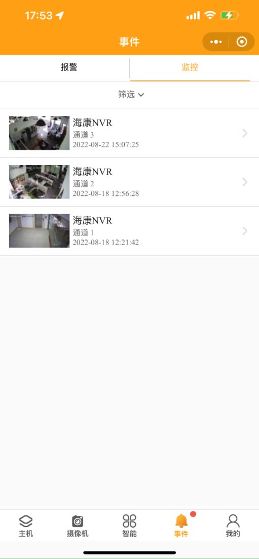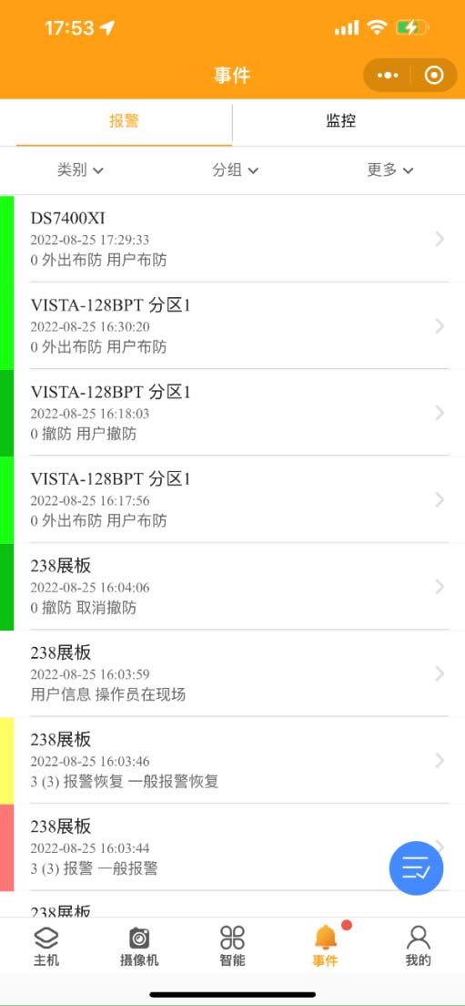 2. 事件:事件界面分為報警和監(jiān)控??砂搭悇e、分組、更多等方式查詢報警事件。