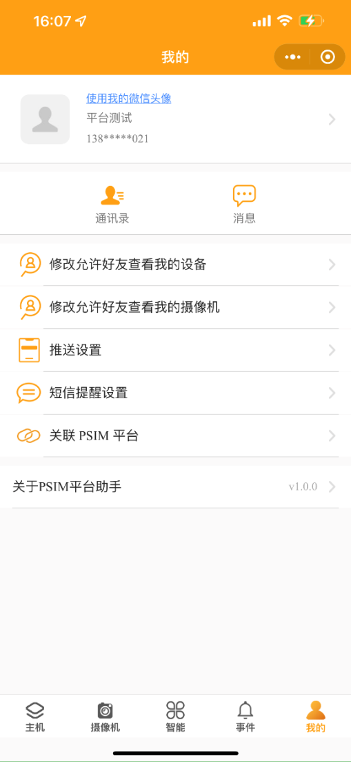 3. 我的:修改允許好友搜索我的設備、修改允許好友查看我的攝像機、推送設置、短信提醒設置、關聯(lián)PSIM平臺這幾項功能和設備詳情里的設置方式相同。點擊頭像可更改頭像、昵稱、修改密碼等。