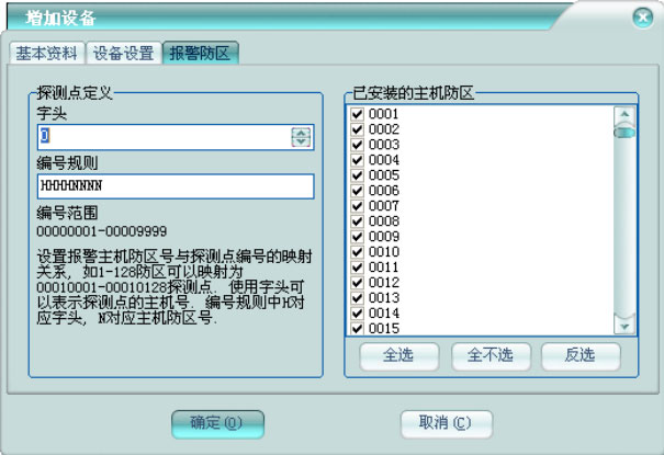 已安裝的主機(jī)防區(qū):選擇報(bào)警主機(jī)當(dāng)前安裝的防區(qū)。