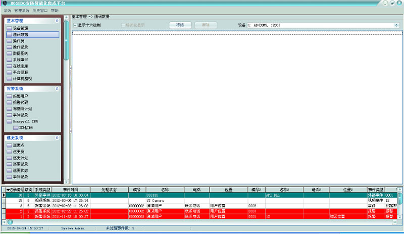 在平臺(tái)軟件中操作面板里的基本管理面板組上,點(diǎn)擊【通訊數(shù)據(jù)】,功能區(qū)將顯示通訊數(shù)據(jù)框,如下圖: