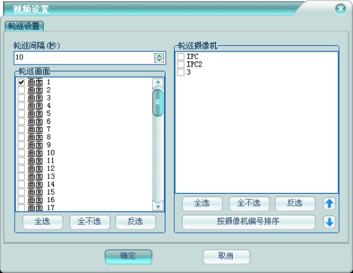 輪巡攝像機(jī):選擇用于做輪巡的攝像機(jī)。通過(guò)向上和向下按鈕可改變攝像機(jī)的輪巡順序。