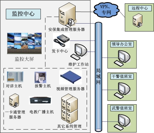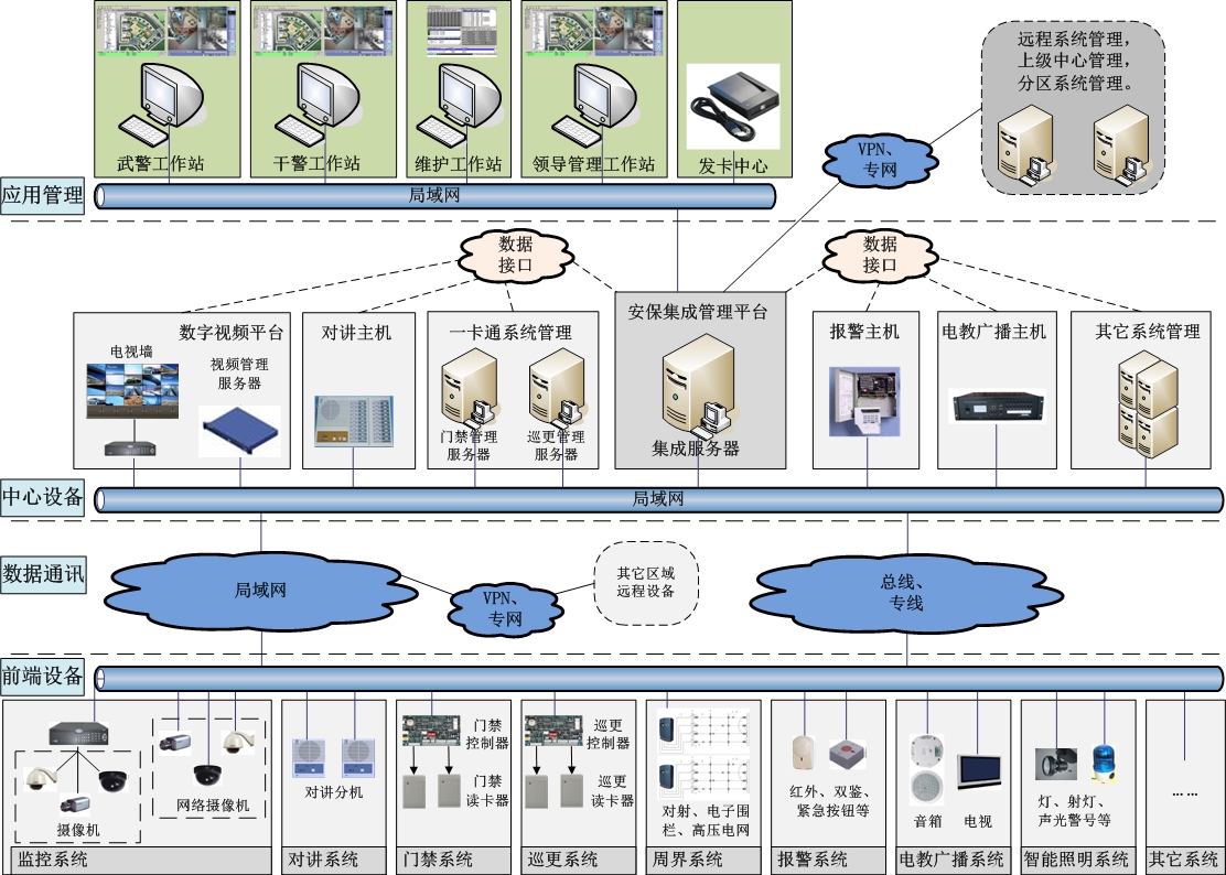數(shù)據(jù)通訊層實(shí)際就是各系統(tǒng)通訊線(xiàn)路,本安保集成系統(tǒng)基于網(wǎng)絡(luò)化設(shè)計(jì),絕大部分安保子系統(tǒng)前端設(shè)備與中心設(shè)備連接都是通過(guò)網(wǎng)絡(luò)與中心設(shè)備通訊;部分子系統(tǒng),例如總線(xiàn)式報(bào)警系統(tǒng),因?yàn)橄到y(tǒng)結(jié)構(gòu)原因,部分會(huì)通過(guò)總線(xiàn)方式傳輸;而電教系統(tǒng),也會(huì)通關(guān)視頻專(zhuān)線(xiàn)連接前端的電視。