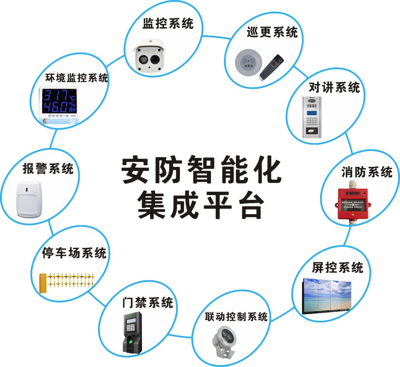 根據(jù)項(xiàng)目要求可任意組合報(bào)警、監(jiān)控、門(mén)禁、巡更、停車(chē)場(chǎng)、對(duì)講、火警、廣播、周界、智能照明、環(huán)境(溫濕度、水位)等系統(tǒng)。