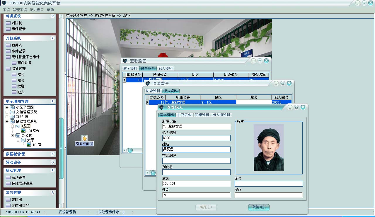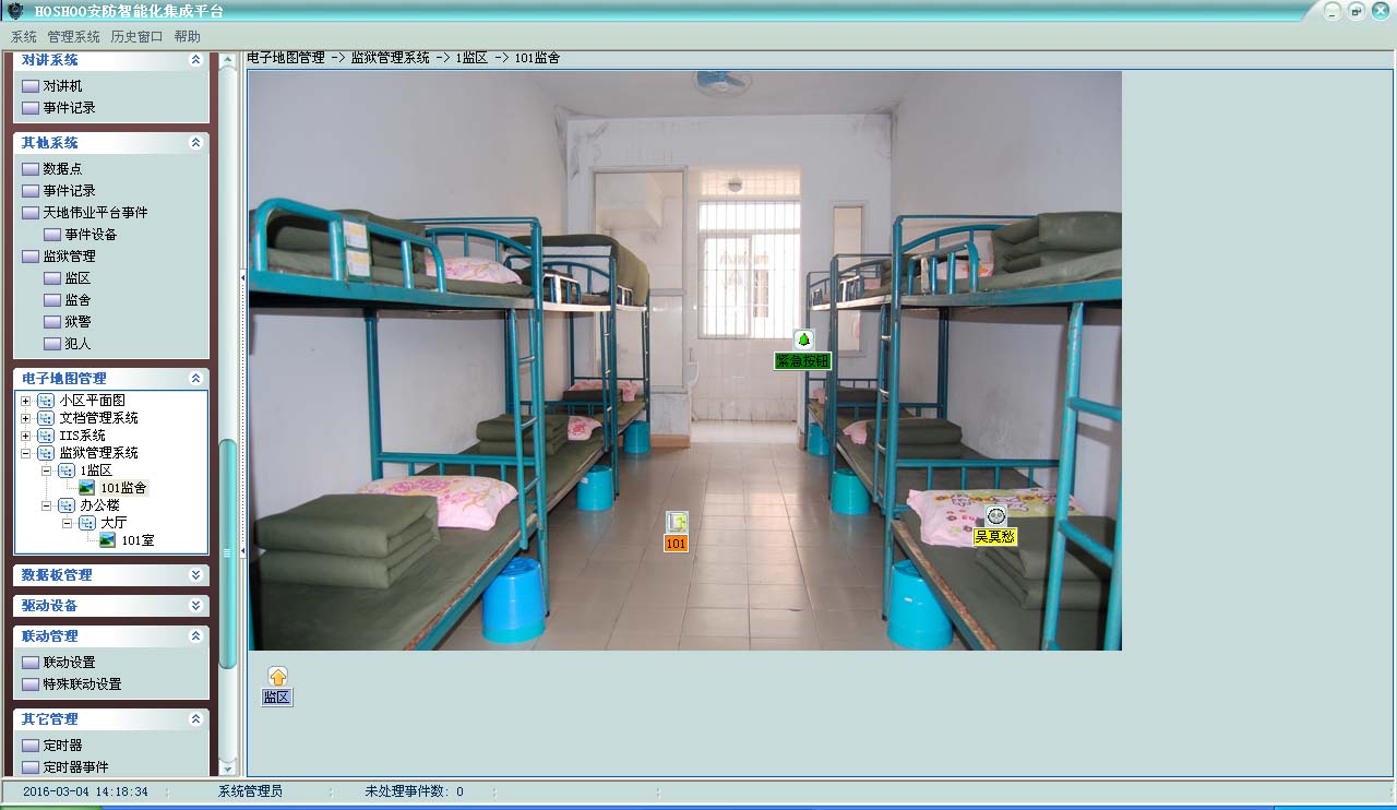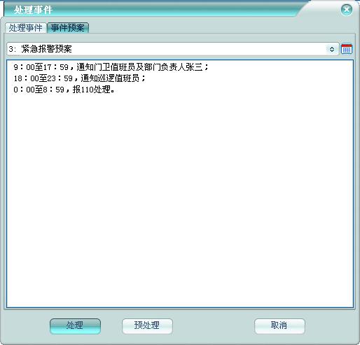 ? 對(duì)各安保子系統(tǒng)報(bào)警事件的及時(shí)響應(yīng)和處理,必要時(shí)可上報(bào)上級(jí)中心,由上級(jí)中心指揮協(xié)同處理;監(jiān)獄管理人員會(huì)針對(duì)各種報(bào)警事件制定相應(yīng)的預(yù)警方案(包括聯(lián)動(dòng)設(shè)制及文字預(yù)案),當(dāng)報(bào)警、門(mén)禁、對(duì)講、監(jiān)控、巡更的各子系統(tǒng)發(fā)生異常時(shí),系統(tǒng)可自動(dòng)根據(jù)聯(lián)動(dòng)設(shè)定觸發(fā)聯(lián)動(dòng)動(dòng)作,同時(shí)調(diào)出文字預(yù)案,值班人員可根據(jù)預(yù)案采取措施。