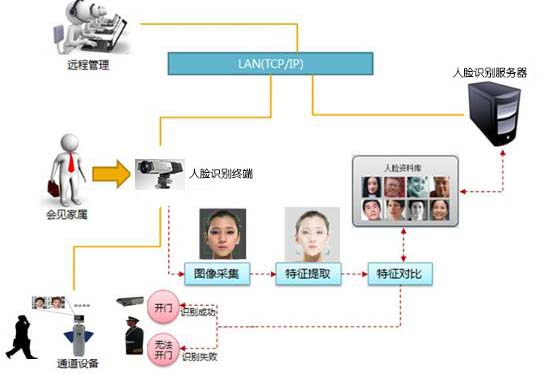 首先對(duì)來(lái)會(huì)見(jiàn)的親屬通過(guò)人臉識(shí)別終端進(jìn)行進(jìn)行臉部特征識(shí)別認(rèn)證,只有認(rèn)證過(guò)的親屬,在通道中識(shí)別成功則打開(kāi)門(mén)禁通道暢通,識(shí)別不成功則無(wú)法打開(kāi)門(mén)禁通道無(wú)法通過(guò),同時(shí)通過(guò)認(rèn)證的會(huì)見(jiàn)家屬信息會(huì)通過(guò)網(wǎng)絡(luò)傳輸?shù)椒?wù)器,遠(yuǎn)程管理人員可以查看前來(lái)會(huì)見(jiàn)的親屬信息,進(jìn)行控制和管理。