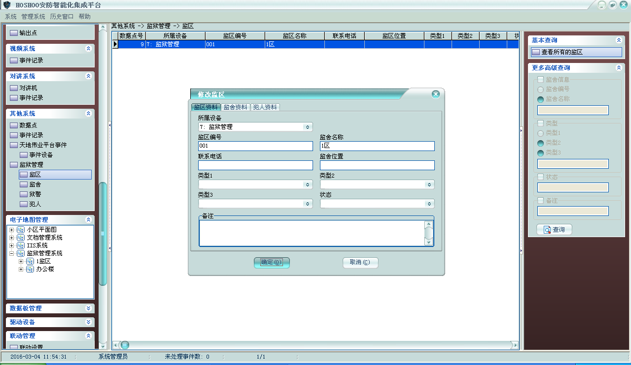 設(shè)置監(jiān)區(qū)名稱(chēng)、編號(hào)、位置、類(lèi)型等相關(guān)數(shù)據(jù)。