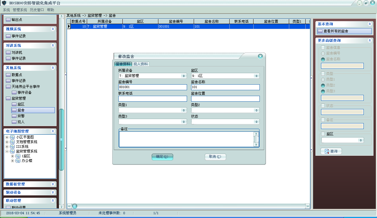 設(shè)置監(jiān)舍名稱(chēng)、編號(hào)、位置、類(lèi)型等相關(guān)數(shù)據(jù)。