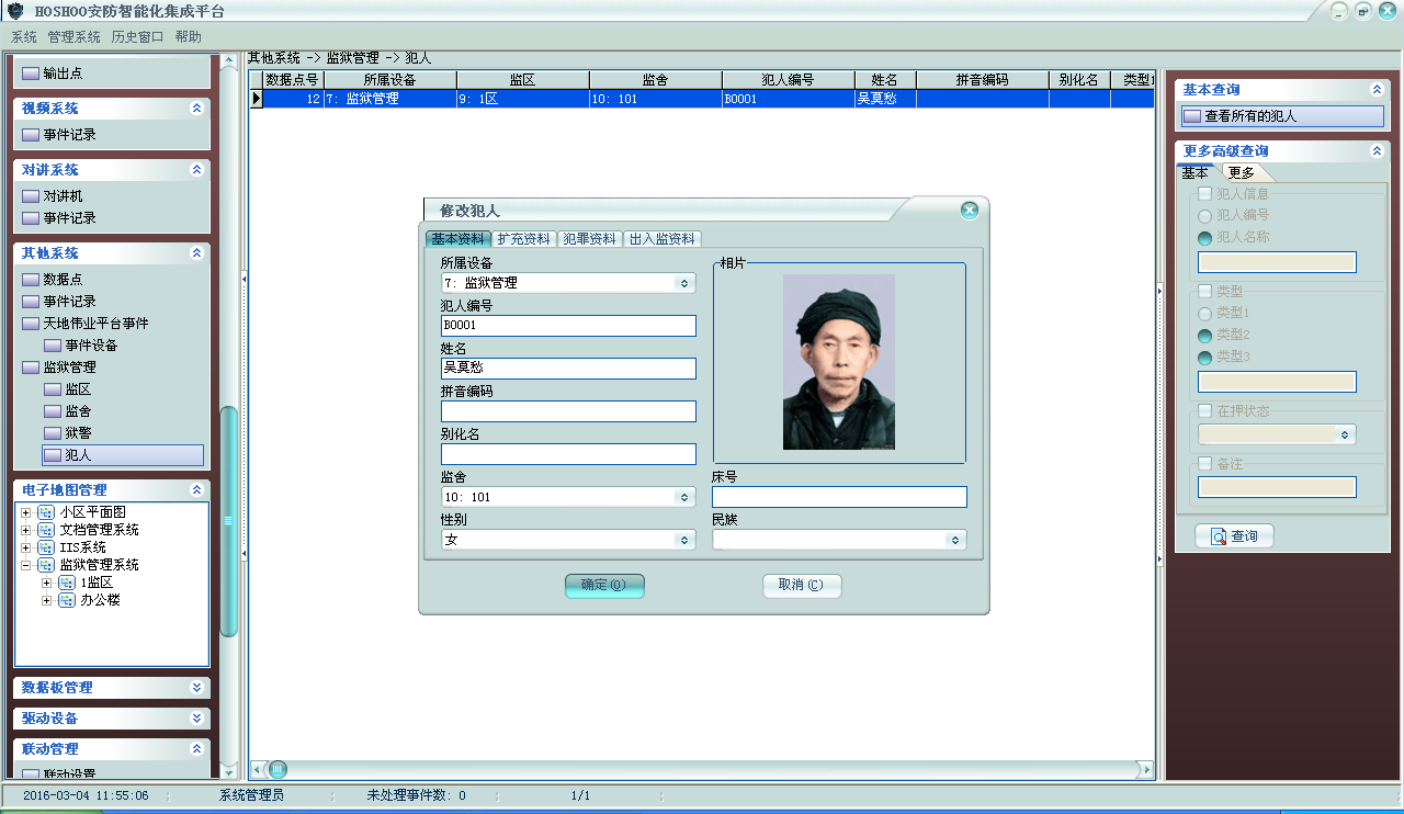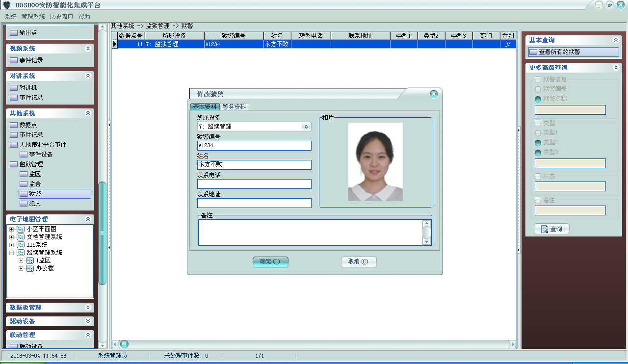 設(shè)置看押人員姓名、編號(hào)、聯(lián)系電話(huà)、地址等相關(guān)數(shù)據(jù),以及犯罪記錄、出入監(jiān)記錄等等。