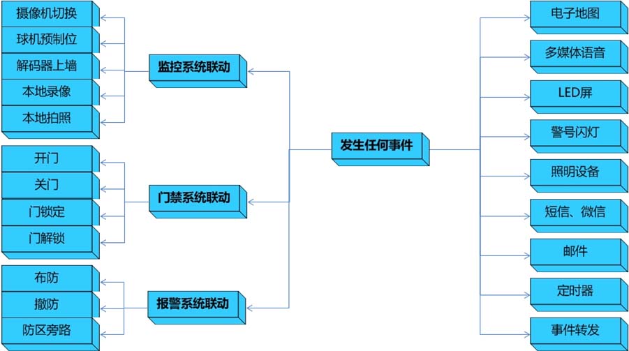 安防各子系統(tǒng)間可任意設(shè)置聯(lián)動(dòng)關(guān)系,只要無(wú)邏輯錯(cuò)誤,都可自行定義聯(lián)動(dòng)策略,一個(gè)事件可設(shè)置多個(gè)聯(lián)動(dòng)動(dòng)作。