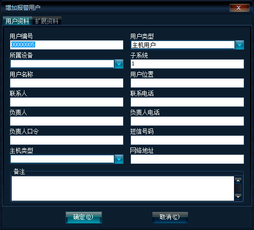 可錄入報(bào)警用戶的聯(lián)系信息和主機(jī)類型及用戶備注。