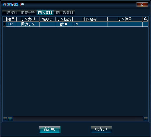 修改報(bào)警用戶時(shí),顯示防區(qū)資料選項(xiàng)頁(yè)。如下圖: