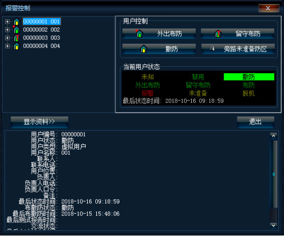 下部為詳細(xì)資料顯示區(qū),用戶樹中,選擇用戶,顯示該用戶的詳細(xì)資料;選擇防區(qū),顯示該防區(qū)的詳細(xì)資料。