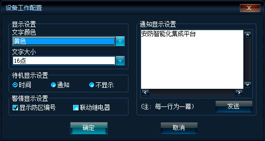 設(shè)置顯示屏的顯示參數(shù):顏色、文字大?。淮龣C(jī)顯示方式、警情顯示設(shè)置和通知顯示設(shè)置。